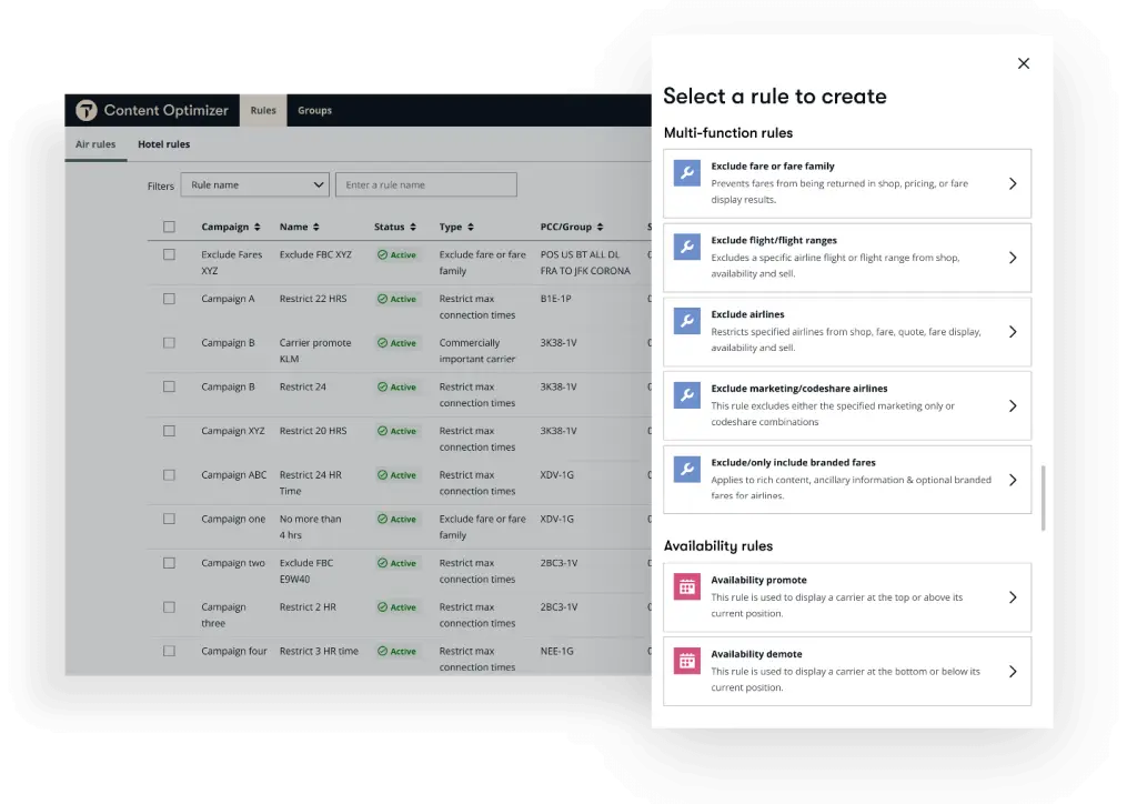 Say goodbye to time wasting calls and tasks — our API Suite makes your apps more efficient. They standardize and consolidate merchandising data from multiple sources (ATPCO, NDC, Direct Connect, Low Cost Carriers and more), and flexibly integrate with existing and future APIs.